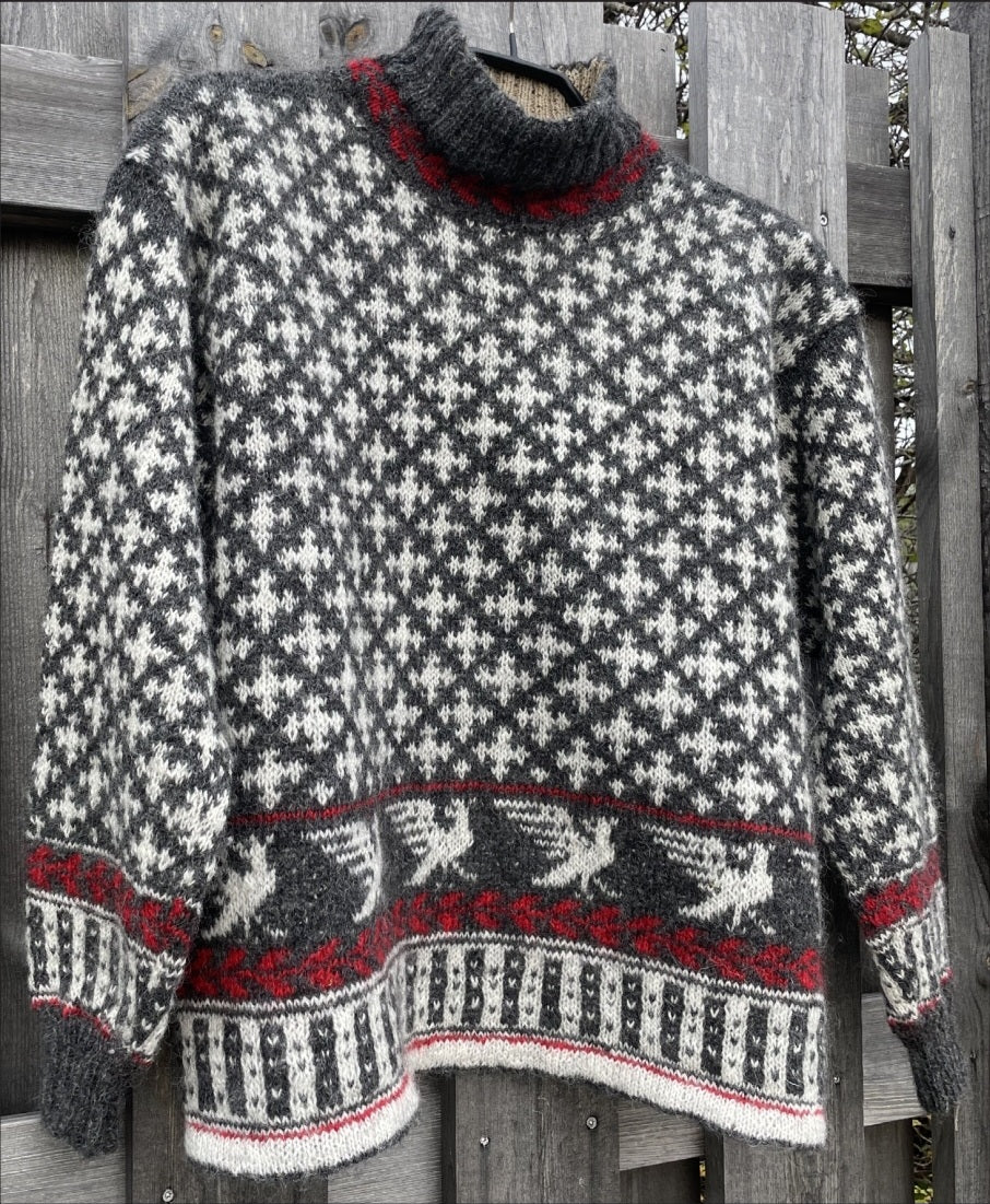 Slätstickad tröja med flingor och fåglar. Stickas på rundstickor nedifrån och upp, Ärmarna monteras i efterhand.