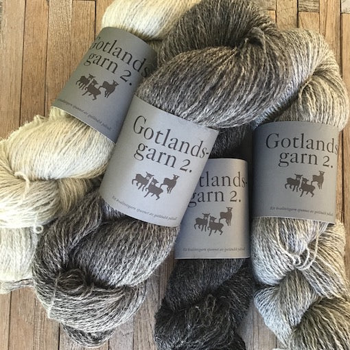 Ett unikt garn spunnet av den mjuka och glansiga ullen från Gotlandsfåret på H. Hjelholts Uldspinderi i Danmark.