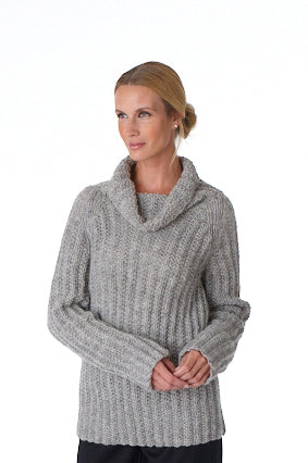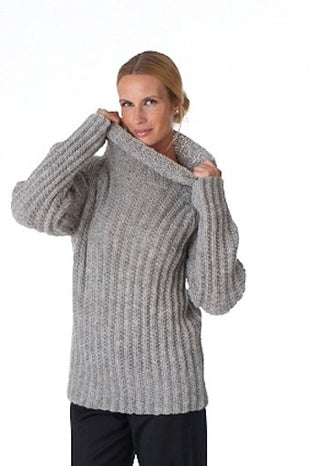 Stickad tröja i falsk ribb med stor krage. Stickas på grova stickor som gör den porös och luftig.